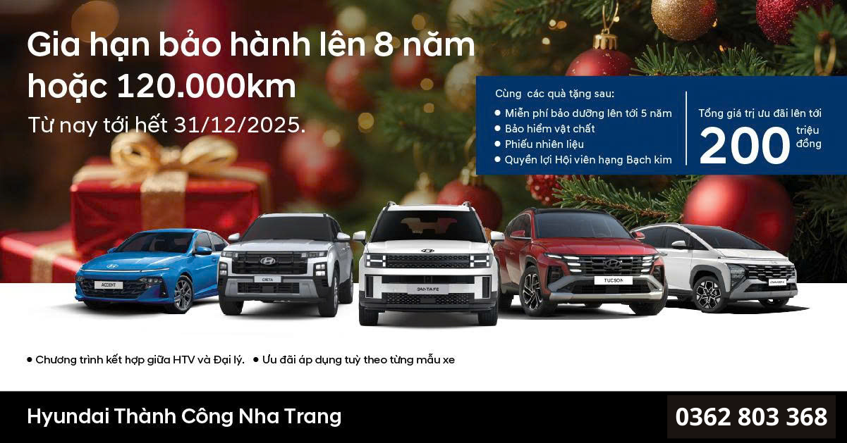 Liên doanh Ô tô Hyundai Thành Công Việt Nam (HTV) khởi động chuỗi ưu đãi toàn diện dành cho khách hàng trong tháng 12, nổi bật với gói “Bảo hành 8 năm – An tâm vận hành”, hỗ trợ tài chính lên tới 200 triệu đồng cho các dòng xe Hyundai.